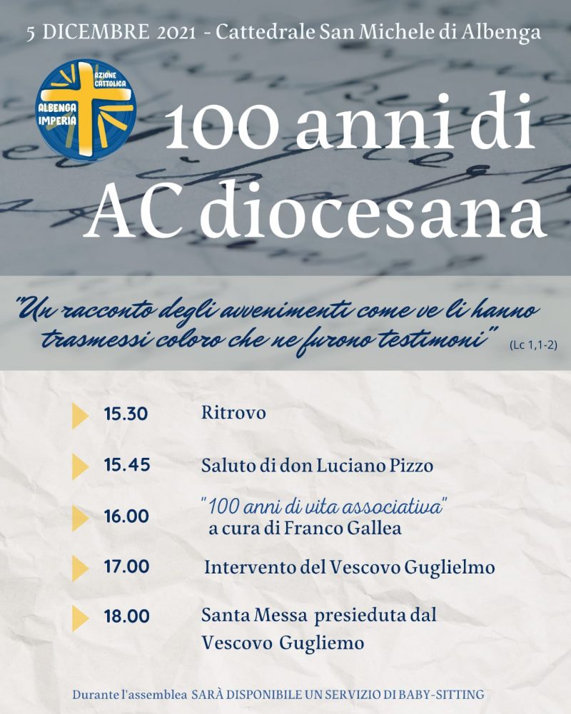 Domenica 5 dicembre nella Cattedrale di San Michele di Albenga l’Azione Cattolica della Diocesi di Albenga – Imperia, si riunisce per festeggiare i 100 anni della A. C. diocesana.