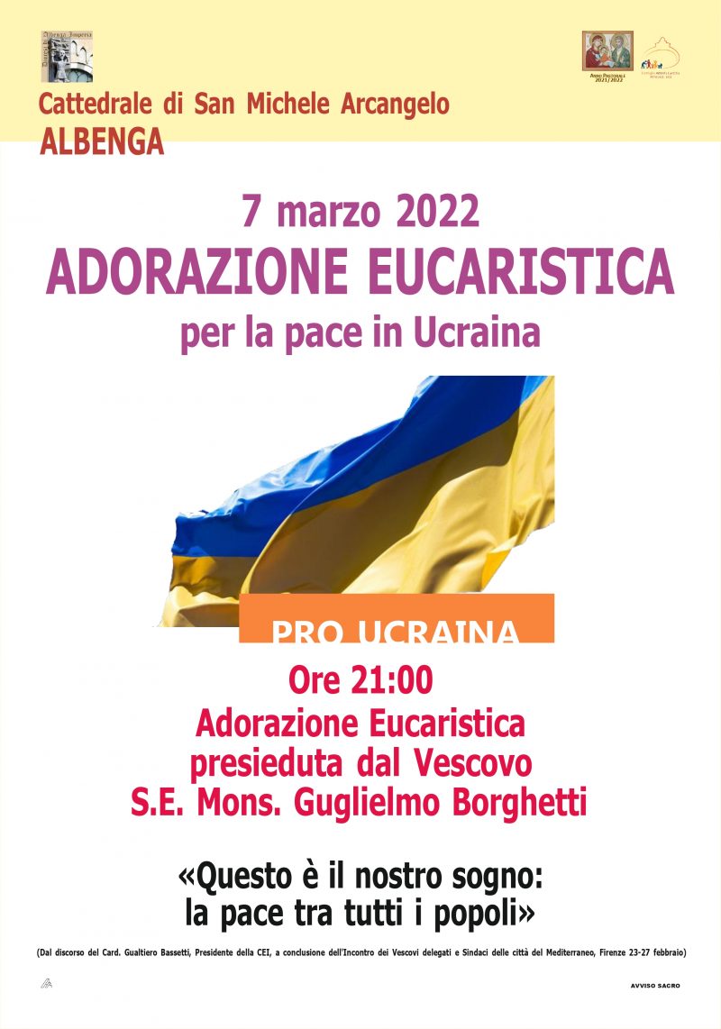 In questa situazione drammatica di guerra vogliamo far sentire il nostro appello per la pace. Lunedì 7 marzo alle ore 21:00, nella Cattedrale di San Michele Arcangelo in Albenga, Adorazione eucaristica per la Pace in Ucraina presieduta dal vescovo Guglielmo.