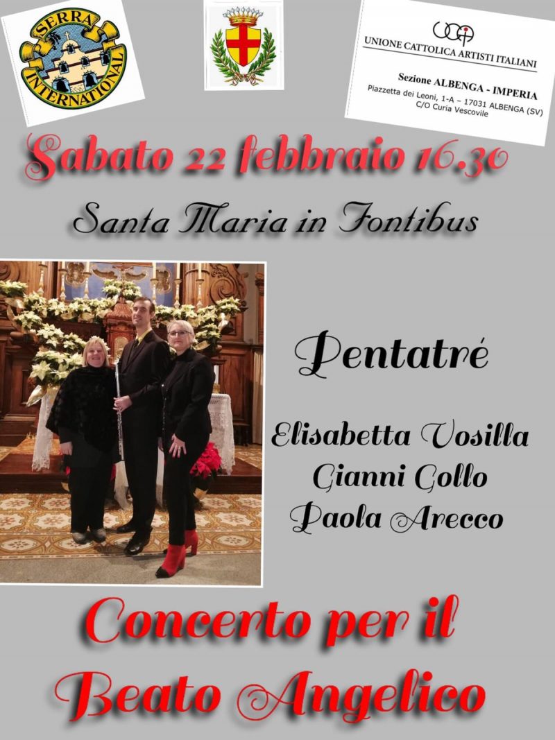 A pochi giorni dalla ricorrenza del Beato Angelico, protettore di tutti gli artisti e santo patrono dell’UCAI, l’associazione è lieta di presentare il concerto dei Pentatrè, che si svolgerà nella giornata di sabato 22 Febbraio, dalle ore 16:30 presso la chiesa di Santa Maria in Fontibus nel centro storico di Albenga, a pochi passi dalla sede stessa dell’associazione sita in Piazza delle erbe.