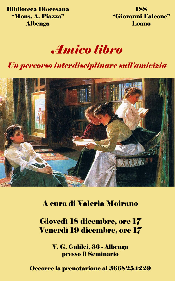 Amico libro: questo il titolo della prossima iniziativa della Biblioteca. Si tratta di un “viaggio” che coinvolge materie diverse e autori molto distanti tra loro anche cronologicamente, nato dalla bella collaborazione con alcuni insegnanti dell’Istituto Secondario di Secondo Grado “Giovanni Falcone” di Loano: la Commissione Biblioteca nata all’interno dell’Istituto. Dopo aver presentato a loro il percorso, è sorta spontanea l’idea di proporlo alle persone che conoscono e seguono la vita della Biblioteca Diocesana.