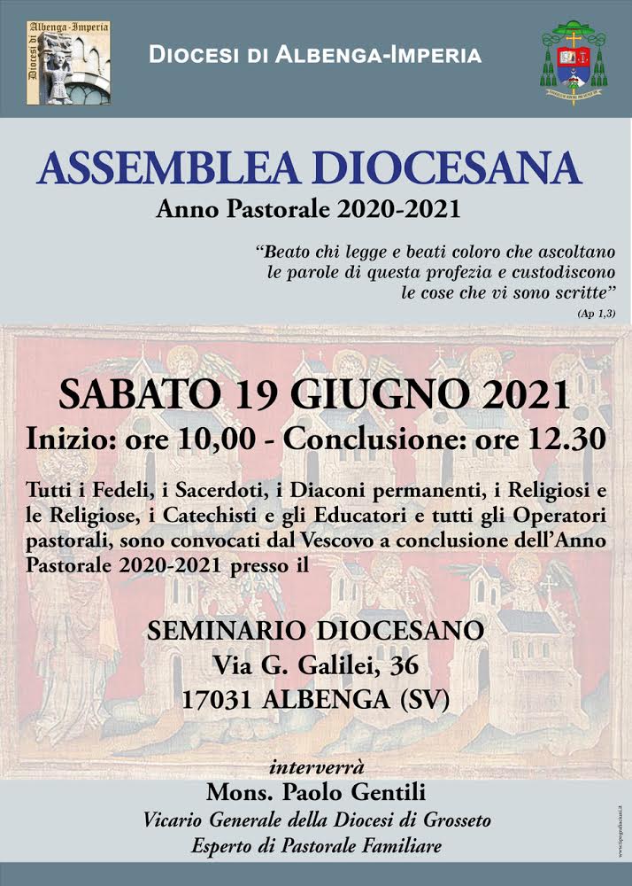 A conclusione dell’Anno pastorale, sabato 19 giugno, si svolgerà presso il Seminario vescovile di Albenga, l’Assemblea diocesana a cui partecipa anche il Vescovo Guglielmo.