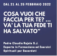 Cosa vuoi che io faccia per te? Va la tua fede ti ha salvato. É questo il titolo del corso di esercizi spirituali per presbiteri e diaconi tenuto da Padre Claudio Rajola S. J. esperto in formazione ed esercizi spirituali. Il corso si terrà presso la Casa F.A.C.I a Marina di Massa dal 21 al 25 febbraio prossimo.
