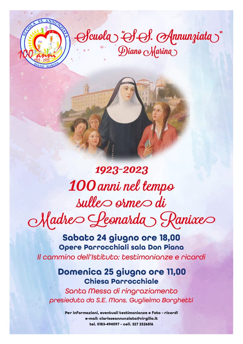 La scuola SS. Annunziata celebra in questi giorni i cento anni di presenza a Diano Marina. Sabato 24 giugno verrà ripercorso il cammino dell’istituto “sulle orme di Madre Leonarda Ranixe” e domenica 25 giugno alle ore 11,00 nella chiesa parrocchiale, il vescovo S.E. Mons. Guglielmo Borghetti celebra una Messa di ringraziamento, animata dal coro parrocchiale e delle suore. Guidati dalle parole di Marco Perasso, ripercorriamo le vicende principali della presenza dell’istituto a Diano Marina. Tra la Prima e la Seconda guerra mondiale, Diano Marina viveva un importante sviluppo economico. L’allora sindaco Nino Ardissone, constatata la carenza di scuole sul territorio cittadino, «non vi erano scuole femminili, neppure una scuola privata né, tanto meno, scuole medie», chiese alle Suore Clarisse della SS. Annunziata di Diano Castello di aprire una casa anche a Diano Marina «in modo da sopperire alle esigenze della gioventù cittadina». In accordo con il vescovo Angelo Cambiaso e il parroco Paolo Novaro, nel 1922 fu aperta una sede distaccata a Diano Marina, affidando a suor Maria Antonietta Poma l’incarico di Madre Superiora e affiancandole altre sei suore. La sede della nuova scuola fu trovata in tempi brevissimi: «i Frati Oblati di Maria Immacolata, che avevano da poco lasciato il proprio convento dianese, cedettero tale struttura per consentire la realizzazione della nuova iniziativa, riuscendo così a reperire una sistemazione in un luogo ideale in cui ancora oggi essa si trova». Il 3 ottobre 1922 ci fu l’inaugurazione della nuova struttura. «Questa era costituita, già in allora, da un ampio fabbricato, fornito di tutte le comodità moderne, ubicata a breve distanza dalla stazione ferroviaria e quasi in riva al mare. La circondano viali e giardini, gode di una posizione favorevolissima per sole e salubrità dell’aria. Il suo interno è signorilmente arredato. La graziosa chiesetta, dedicata a Maria Immacolata, è aperta al pubblico sia per le funzioni religiose che per offrire un luogo di raccoglimento per i fedeli». Il nuovo istituto poté accogliere bambini di ambo i sessi con giardino per l’infanzia, scuole elementari e medie inferiori. Nell’istituto fu possibile ospitare alunne sia esterne che convittrici; trovarono la loro sede il Circolo della Gioventù femminile Cattolica e il laboratorio delle Dame Missionarie; venne inaugurato per le domestiche un luogo di aggregazione ove trascorrere il proprio tempo libero; venne eretta la Pia Unione dell’Ospitalità della Preghiera e dei Crociatini e, nel 1925, il Terzo Ordine Francescano. Il 24 maggio 1938, festa di Maria SS Ausiliatrice, il Provveditore agli Studi dichiarava la parificazione dell’istituto. Ma a dispetto del «notevole numero di studenti e di convittrici, la mancanza di religiose in qualità di personale insegnante, portò alla dolorosa scelta, terminato l’anno scolastico 1954/55, di rinunciare alla parificazione sia della scuola media che dell’Istituto Magistrale a causa dell’insostenibile costo del personale docente “esterno”». Gli anni del secondo conflitto mondiale vedono le Suore Clarisse della SS. Annunziata cimentarsi in corsi serali per l’alfabettizzazione della truppa. Con la fine del conflitto l’attività didattica e di riferimento spirituale per la comunità locale, riprende con rinnovato entusiasmo, anche se, a causa dei corsi di gestione sempre più onerosi, furono chiusi i corsi magistrali, le medie e la scuola elementare. La scuola materna, invece, continua tutt’ora, unitamente ai corsi di catechismo. «Sono stati centinaia e centinaia di giovani dianesi a formarsi nelle aule e a giocare nei giardini dell’istituto. Gli anni dell’infanzia trascorsi presso la SS. Annunziata hanno lasciato indelebili ricordi che moltissimi rievocano con gioia se non, addirittura, con vera e propria commozione».