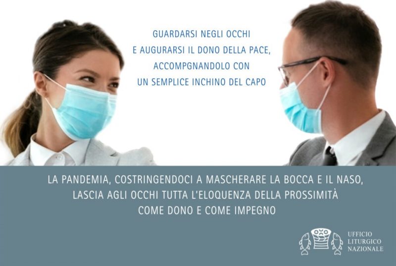 Non apparendo opportuno nel contesto liturgico sostituire la stretta di mano o l’abbraccio col toccarsi con i gomiti, in questo tempo – hanno affermato i Vescovi – può essere sufficiente e più significativo guardarsi negli occhi e augurarsi il dono della pace, accompagnandolo con un semplice inchino del capo. L’impossibilità del contatto fisico domanda più tatto nei rapporti. La pandemia, costringendoci a mascherare la bocca e il naso, lascia agli occhi tutta l’eloquenza della prossimità come dono e come impegno. Il Cardinale Gualtiero Bassetti, Presidente della Conferenza Episcopale Italiana, ha detto: «le mascherine, i contatti ridotti possono essere letti simbolicamente, come un invito a riscoprire la forza dello sguardo». All’invito del diacono (o in sua assenza di chi presiede la celebrazione): «scambiatevi il dono della pace», volgere i propri occhi per intercettare quelli del vicino e accennare un inchino, può esprimere in modo assai eloquente, sicuro e sensibile, la ricerca del volto dell’altro, per accogliere e scambiare il dono della pace, fondamento di ogni fraternità.