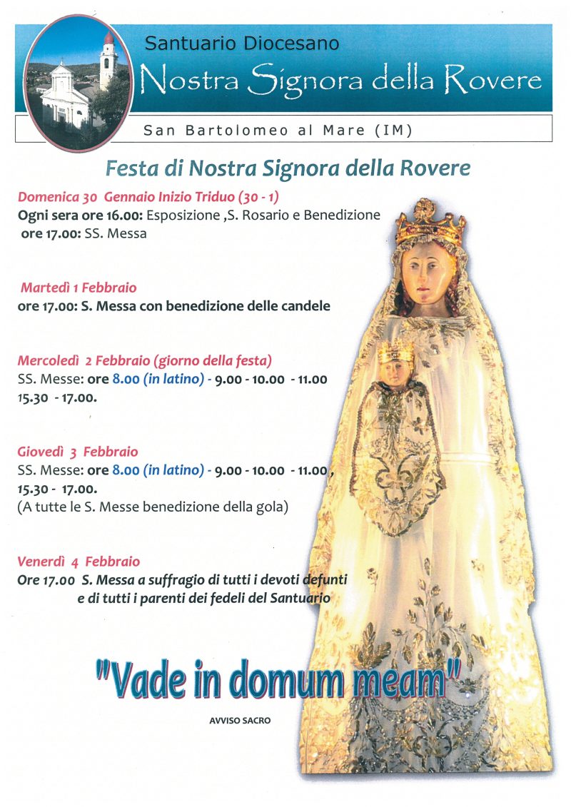 Al santuario diocesano Nostra Signora della Rovere di San Bartolomeo al Mare sono iniziati i festeggiamenti in onore della vergine Maria, nell’ambito della ricorrenza della Presentazione al tempio di Maria santissima. La chiesa di Nostra Signora della Rovere è tra le più antiche e importanti della Liguria, punto di riferimento per i fedeli e meta di pellegrinaggi, essendo stato nel 1671 luogo di apparizione della Madonna e in seguito di guarigioni miracolose. Domenica 30 gennaio, alle 16 ci sarà l’esposizione, la recita del S. Rosario e la Benedizione Eucaristica a cui seguirà la S. Messa. Martedì 1° febbraio la benedizione delle candele, alle 17:00. Mercoledì 2, il giorno della festa, le Messe avranno inizio alle 08:00, seguiranno i consueti orari domenicali: 09:00 -10:00 – 11:30 –15:30 e 17:00. Giovedì 3, memoria di san Biagio, durante ogni celebrazione con i consueti orari domenicali 09:00 -10:00 – 11:30 –15:30 e 17:00 verrà impartita la benedizione alla gola. Venerdì 4 febbraio alle ore 17:00 S. messa a suffragio di tutti i devoti defunti e di tutti i parenti dei fedeli del santuario.