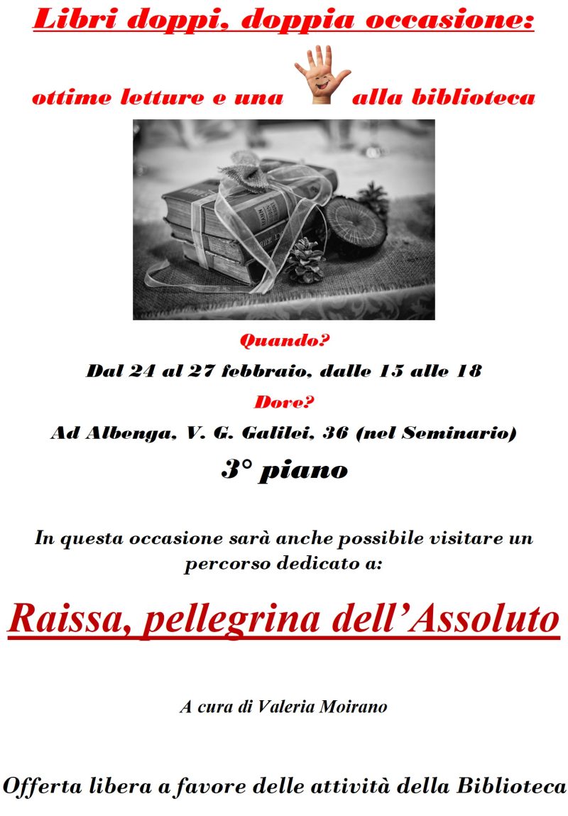 L’iniziativa – curata dalla bibliotecaria, Valeria Moirano – si arricchisce di ulteriori contenuti; sarà infatti possibile visitare un’esposizione di volumi legati dal tema: “Raissa, pellegrina dell’Assoluto”. Moglie del famoso filosofo Jacques Maritain, Raissa, con la sua opera poetica e i suoi scritti spirituali, è testimone di un percorso umano e religioso fuori dal comune, capace di fornire indicazioni preziose nel buio del momento storico che l’umanità sta affrontando. La sua vita testimonia che la conversione è la strada e la chiamata di ogni giorno e che, insieme ad amici grandi e veri, è possibile affrontare qualunque sfida.