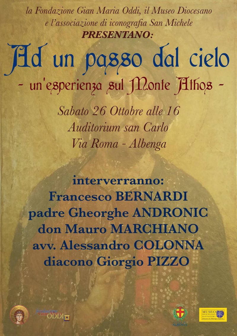 Sabato 26 ottobre, alle ore 16, nell’auditorium san Carlo di Albenga, la fondazione Oddi, il Museo diocesano e l’Associazione di iconografia san Michele, presentano l’incontro: “Ad un passo dal cielo”, il racconto di un’esperienza sul monte Athos. Alla presentazione interverranno Francesco Bernardi, padre Andronic, don Mauro