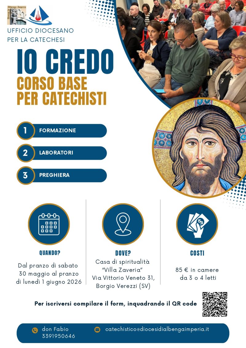Come già anticipato nel corso dell’anno, da don Fabio Bonifazio – Direttore dell’Ufficio catechistico – il medesimo Ufficio propone una tre giorni di formazione, dal pranzo di sabato 30 maggio al pranzo di lunedì 1° giugno, per catechisti ed educatori sul tema del “Credo”. Il corso si svolgerà presso la casa delle Suore Sacramentine di Villa Zaveria a Borgio.