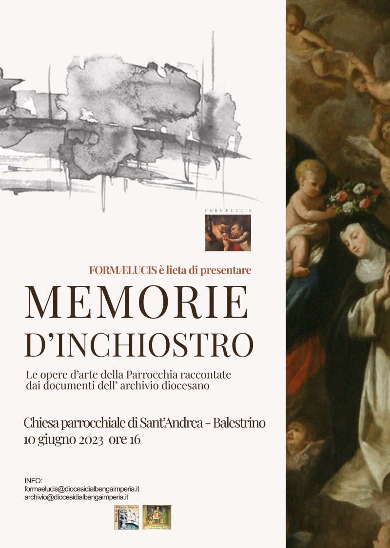 Nell’ambito del progetto “Memorie d’Inchiostro” organizzato da Formae Lucis si terrà sabato 10 giugno alle ore 16,00, presso la chiesa parrocchiale di Sant’Andrea di Balestrino, l’incontro sulle opere d’arte della Parrocchia raccontate dai documenti dell’archivio diocesano.