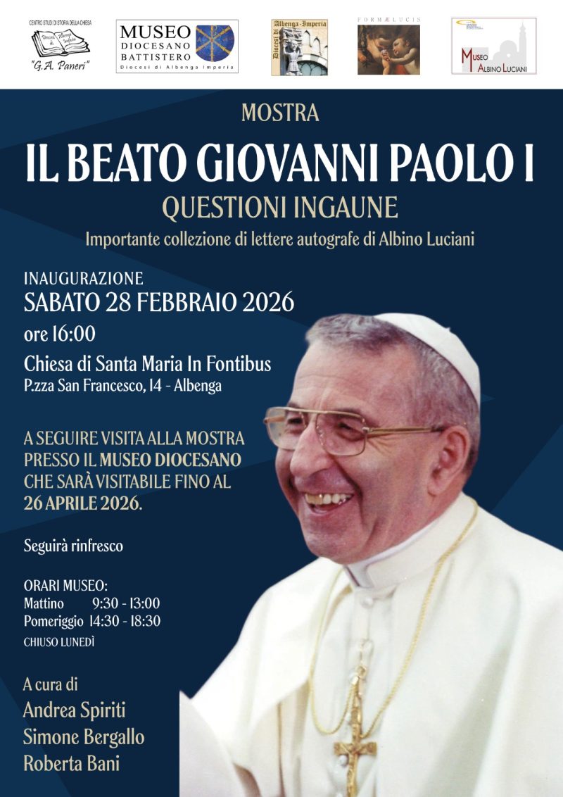 Sabato 28 febbraio alle ore 16.00, ad Albenga nella chiesa di Santa Maria in Fontibus, alla presenza di S.E. Mons. Guglielmo Borghetti, sarà inaugurata la mostra “Il Beato Giovanni Paolo I, questioni Ingaune”.