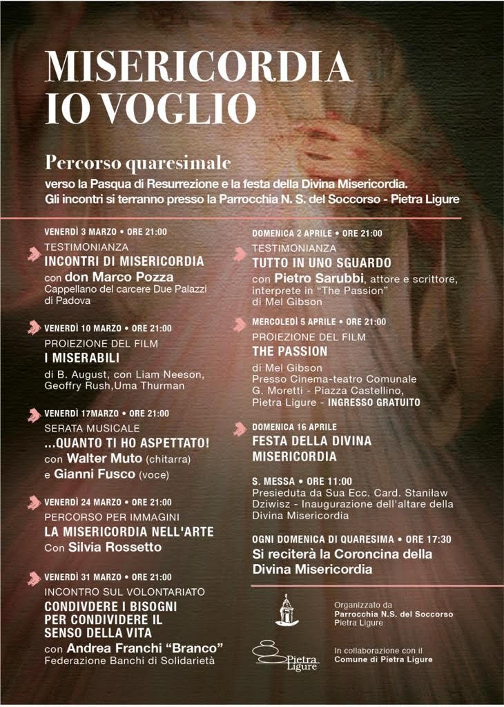 Quest’anno per prepararsi alla Pasqua di Resurrezione e alla festa della Divina Misericordia la Parrocchia N.S. del Soccorso in Pietra Ligure propone un percorso scandito da diversi appuntamenti illustrati nella locandina.