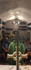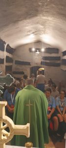 Momento centrale della giornata è stata la celebrazione della Messa proprio all’interno delle catacombe. In un’atmosfera raccolta e suggestiva, tra le mura intrise di fede e speranza, abbiamo vissuto la liturgia come una vera esperienza di comunione. Ogni parola, ogni gesto, ogni canto sembrava carico di significato nuovo, quasi a volerci ricordare che anche oggi siamo chiamati a essere testimoni di una gioia che supera ogni paura.