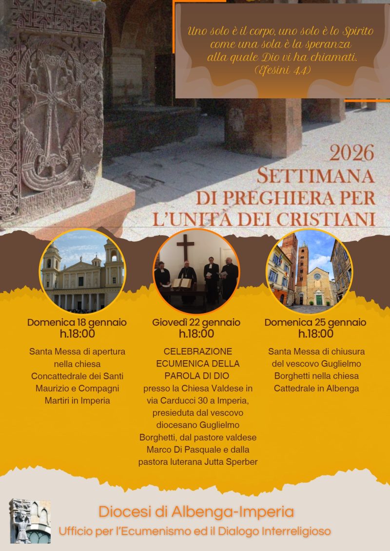 “Anche quest’anno, nel mese di gennaio, ci attendono due appuntamenti importanti: il 17 gennaio la giornata nazionale del dialogo ebrei – cristiani e subito dopo dal 18 al 25 gennaio la settimana di preghiera per l’unità dei cristiani. Nel primo caso è importante ricordare come in questo anno, nonostante le difficoltà date soprattutto per il conflitto, o meglio i conflitti mediorientali, la CEI e l’Assemblea … Continua a leggere Settimana di preghiera per l’Unità dei cristiani 2026