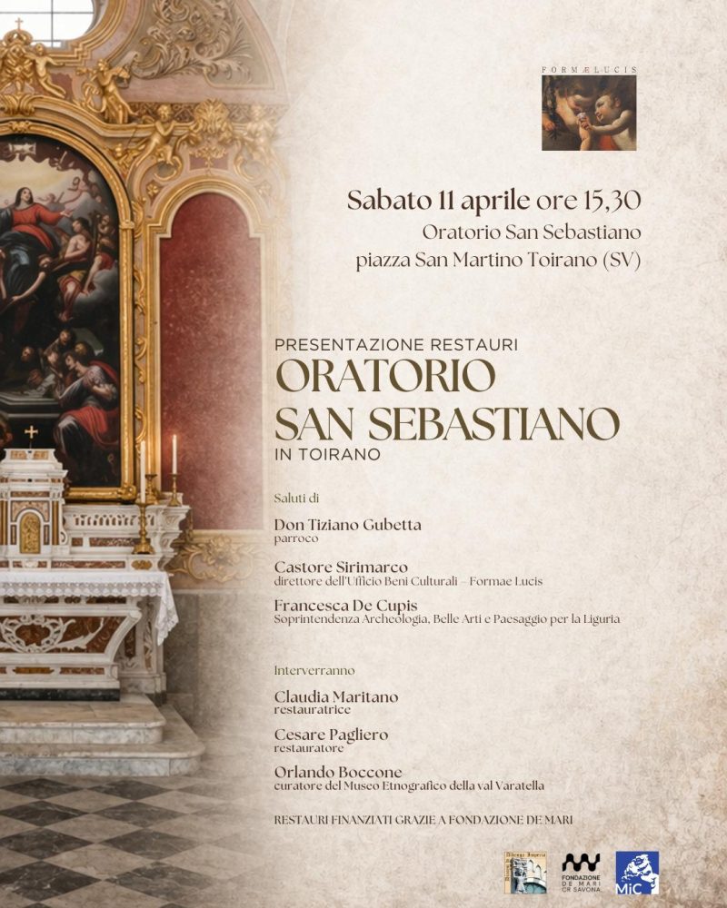 Un importante intervento di recupero restituisce alla comunità uno dei suoi luoghi più affascinanti: l’Oratorio di San Sebastiano. Sabato 11 aprile, alle ore 15.30, proprio all’interno dell’Oratorio (Piazza San Martino, Toirano) si terrà la presentazione ufficiale dei restauri.